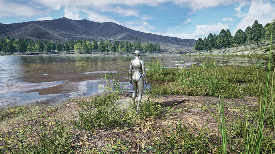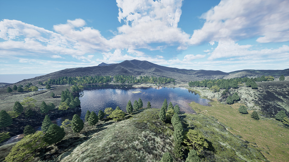 点群やフォトグラメトリ由来のDEMデータを、ゲームエンジン対応のハイトマップへ変換し、スケールや位置などを調整して取り込み、地形を再現します。地表の分類は関連した位置情報などを活用し、岩肌や草地などの範囲に対して、マテリアルの設定を行い作業時間を効率化します。樹木などの配置にはプロシージャル(Procedural)な配置ツールなどを用い、サイズやテクスチャにランダム性を加え、自然さながらのリアリティに向上させます。